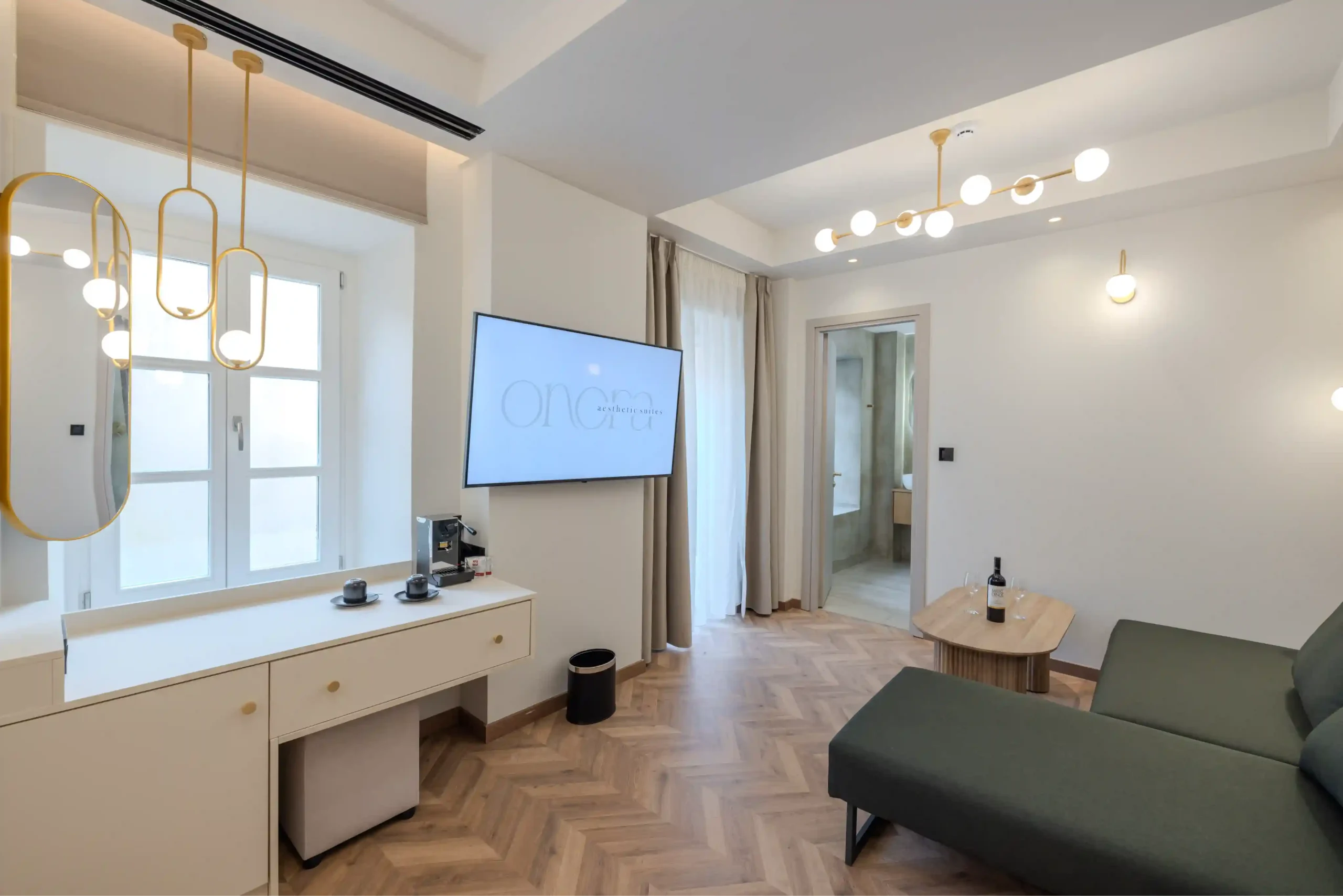 The Luxury Family Suite offers a spacious and elegant retreat designed for families seeking comfort and style. The suite features a king-size bed and a sofa bed with premium linens, a generous living and lounging area, modern amenities such as flat-screen TVs, high-speed Wi-Fi, and a minibar, as well as child-friendly touches including a crib upon request. The bright interior, filled with natural light from large windows, blends subtle classic elements with modern finishes. It also includes a luxurious bathroom with a walk-in shower and premium toiletries, a private balcony, a cozy sitting area, and a dedicated workspace. Designed to combine neoclassical elegance with modern convenience, the suite comfortably accommodates up to four adults.