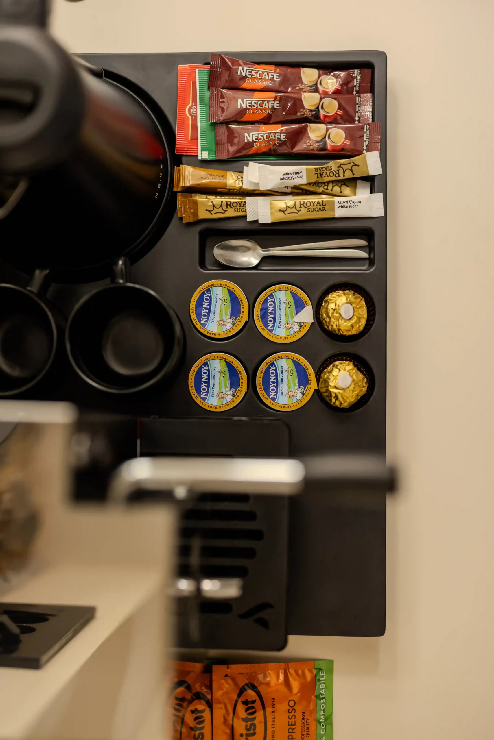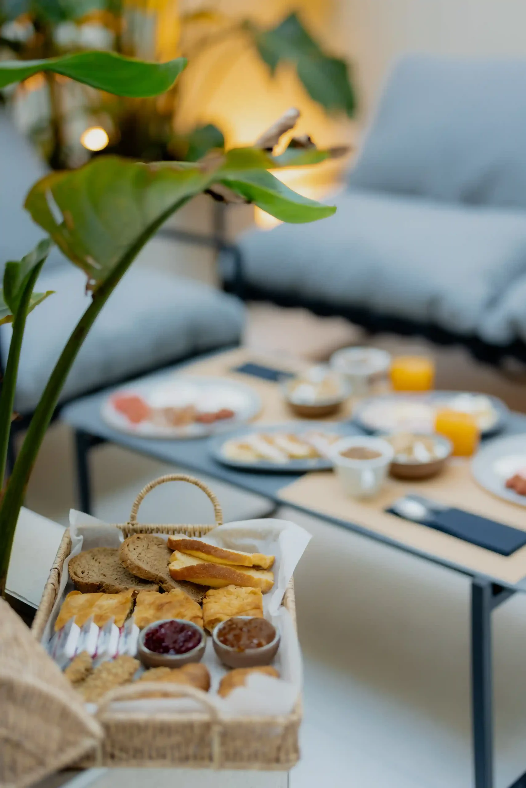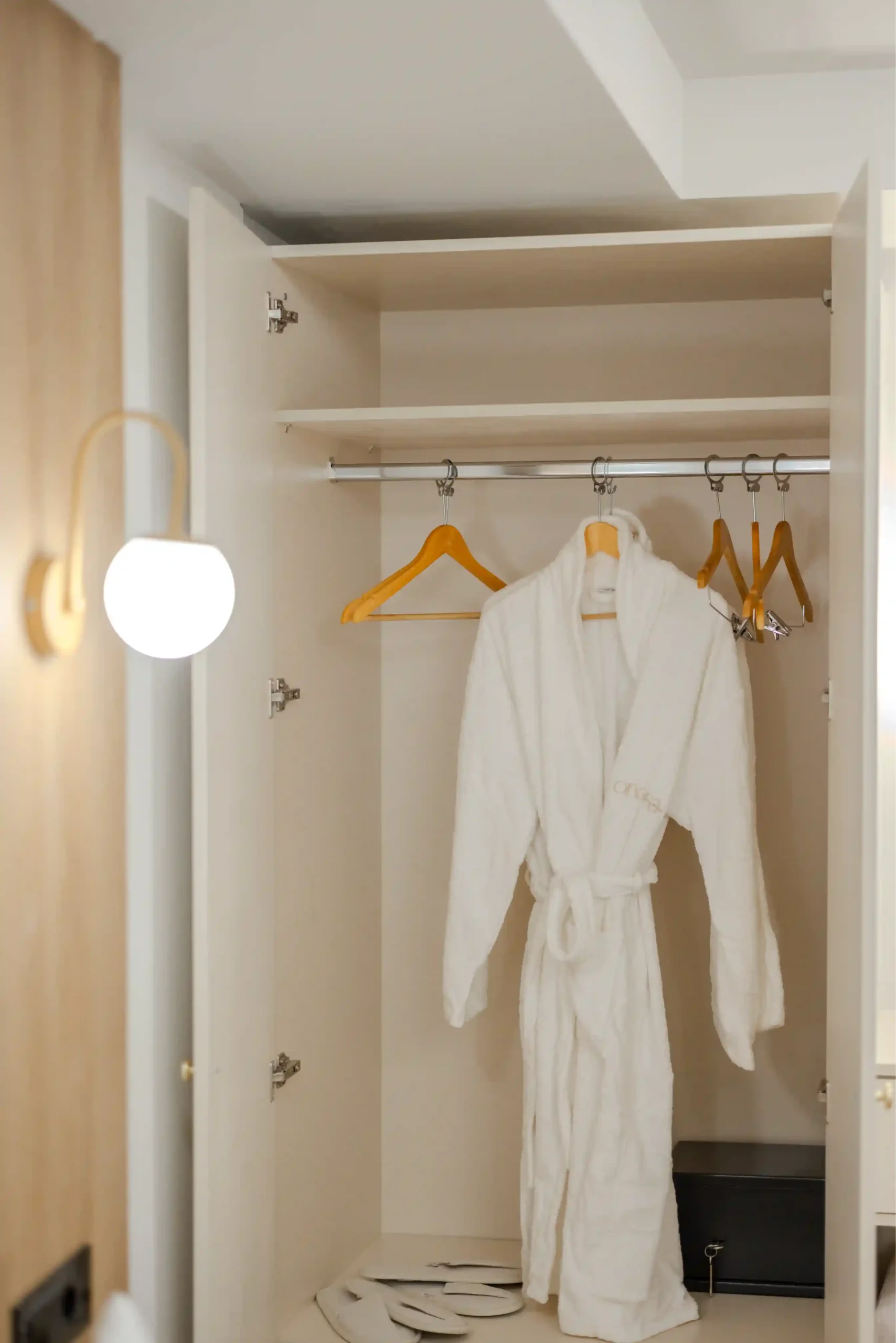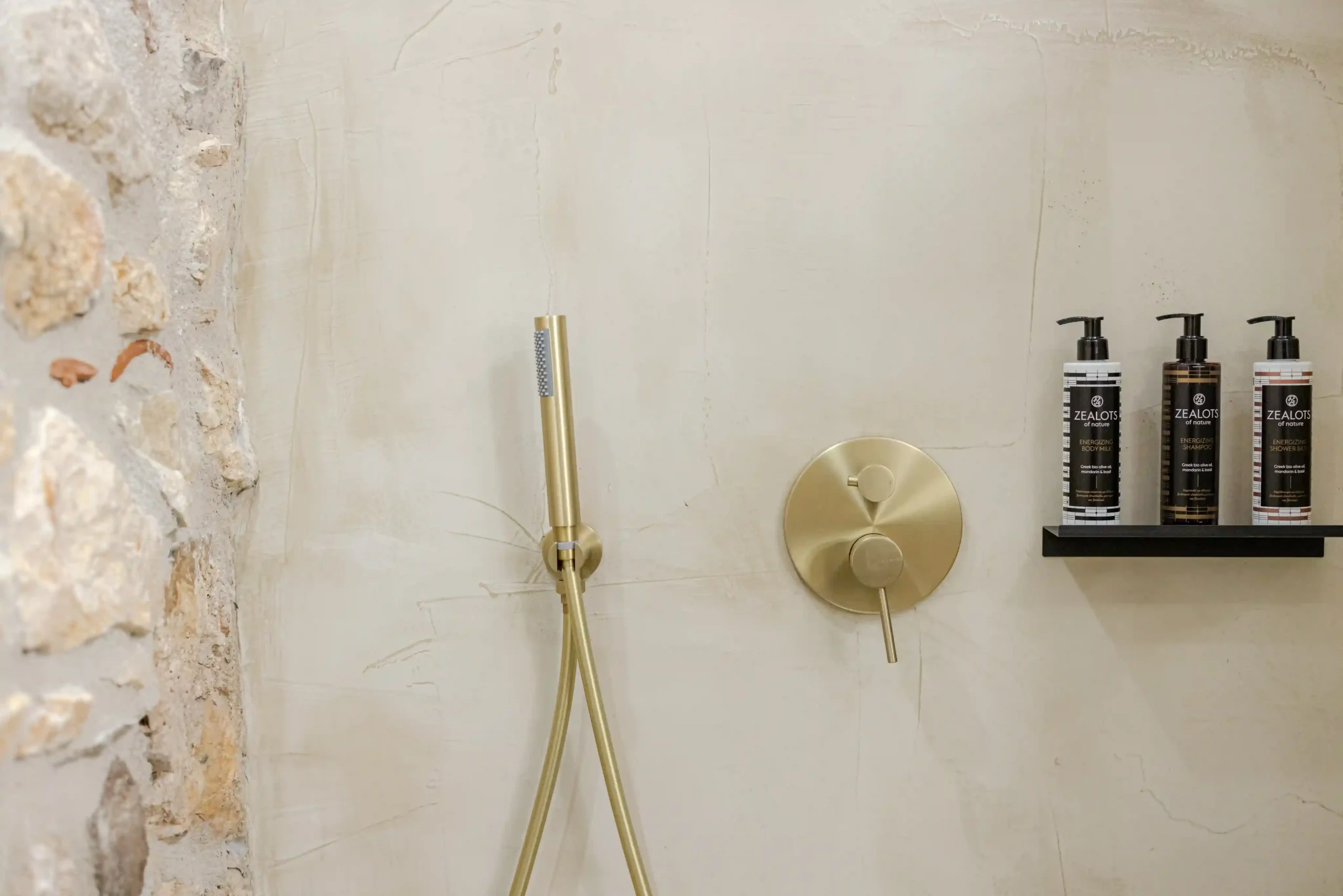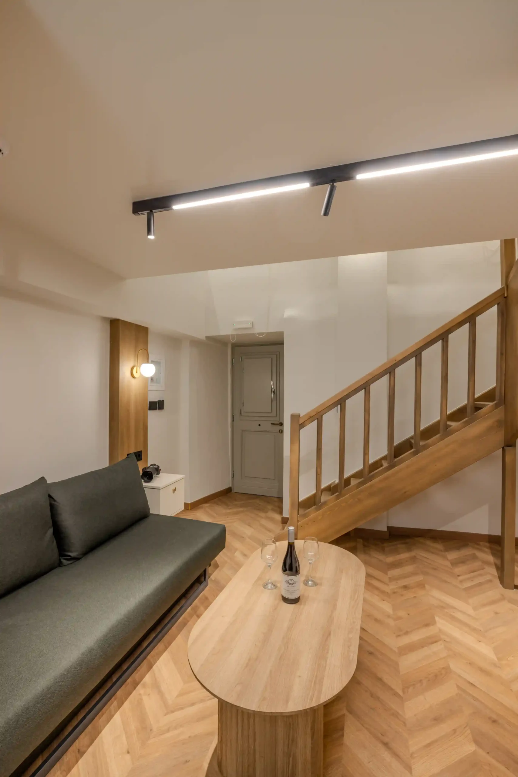This luxury duplex suite combines elegant design with modern comfort across two levels. The lower floor features a stylish living area with designer furnishings and a Smart TV, along with a unique en-suite bathroom built around the building’s original 200-year-old foundation rock, complete with a rainfall shower, separate toilet, and premium toiletries. Upstairs, the private bedroom offers a king-size bed with luxurious linens, a closet, and large windows that fill the space with natural light. With refined décor, high-end finishes, minibar, and high-speed Wi-Fi, the suite comfortably accommodates up to three adults.