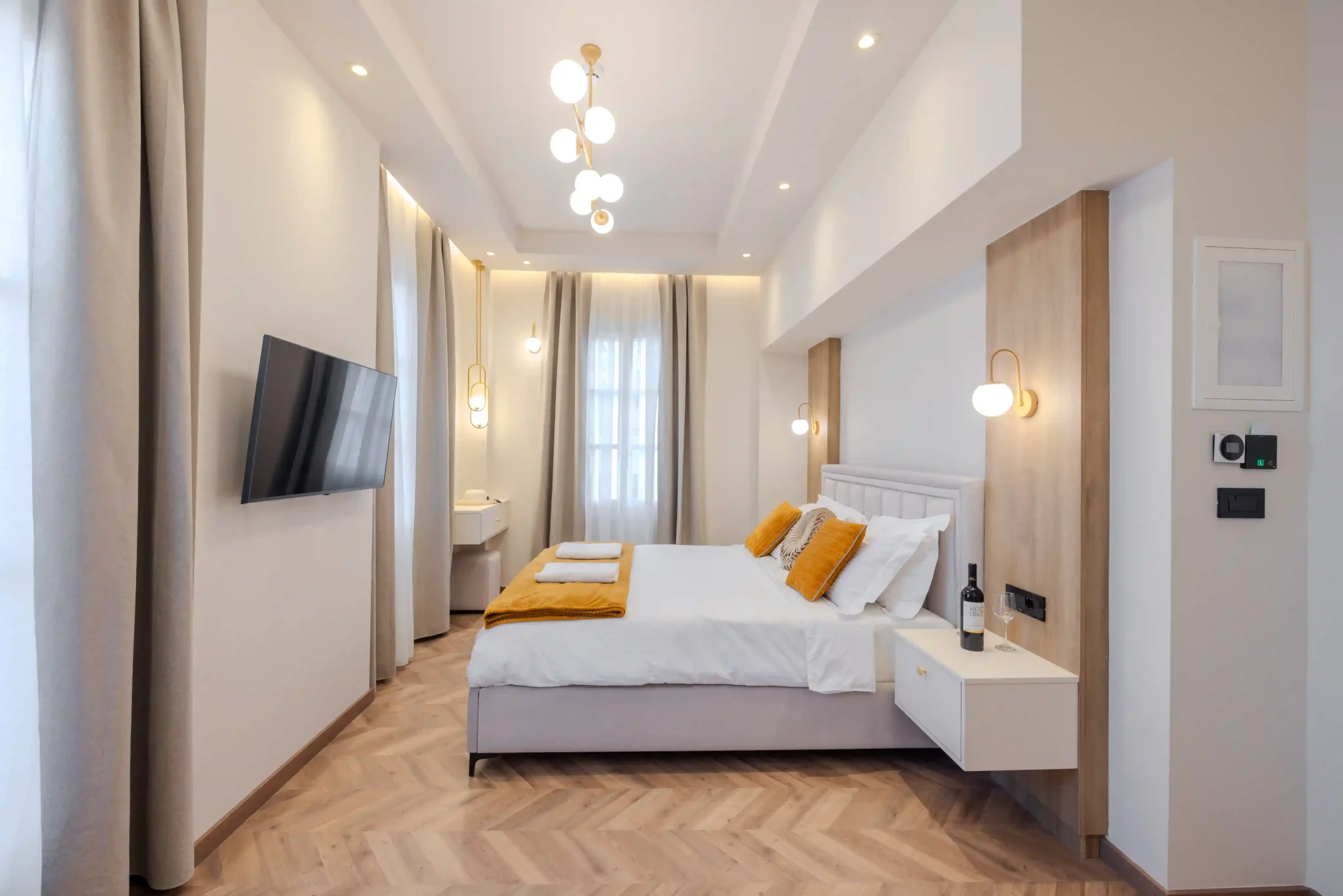 The Premium Junior Suite offers a stylish and comfortable stay, featuring a plush double bed with luxurious linens, modern décor, and warm lighting. The room includes a flat-screen TV, work desk, high-speed Wi-Fi, minibar, and safety deposit box, along with a sleek en-suite bathroom with a walk-in shower and premium toiletries. Large windows fill the space with natural light, while a private balcony adds an extra touch of relaxation. The suite comfortably accommodates two adults.