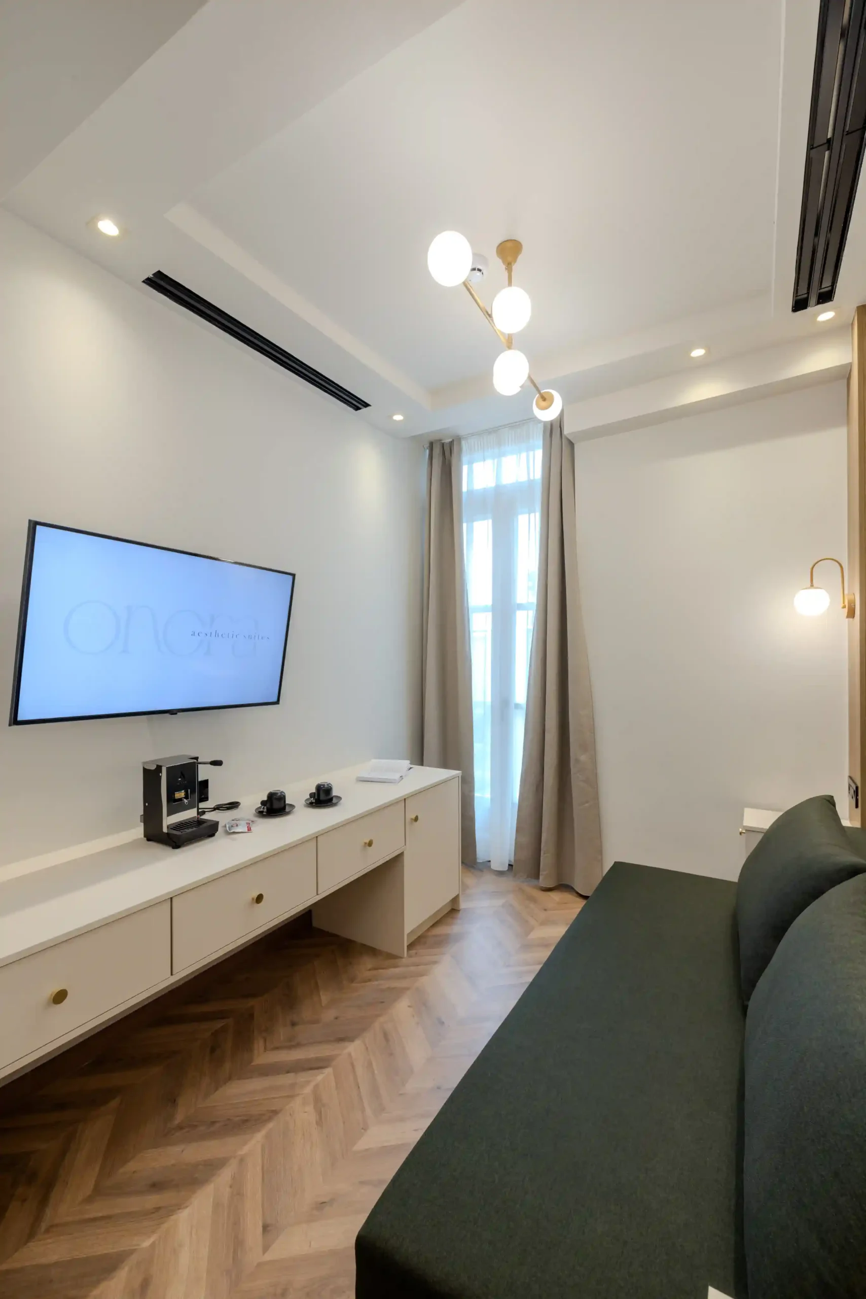 The Luxury Family Suite offers a spacious and elegant retreat ideal for families, combining refined design with modern comfort. It features a king-size bed and a sofa bed for one adult, a comfortable living area, modern amenities such as flat-screen TVs, high-speed Wi-Fi, and a minibar, as well as a luxurious bathroom with a walk-in shower and premium toiletries. The suite also includes a large private terrace, a cozy sitting area, and a workspace, blending neoclassical elegance with modern convenience. It can comfortably accommodate up to three adults.